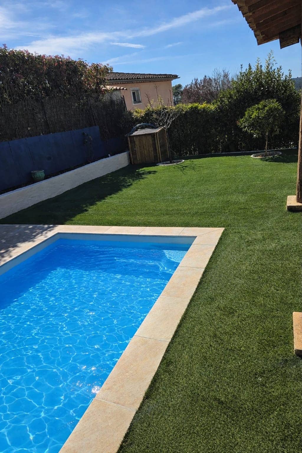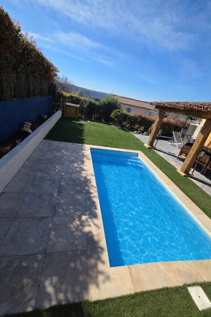 Cet aménagement extérieur avec plage de piscine et jardin à Montauroux combine différents matériaux. Il crée un espace extérieur complet et harmonieux.