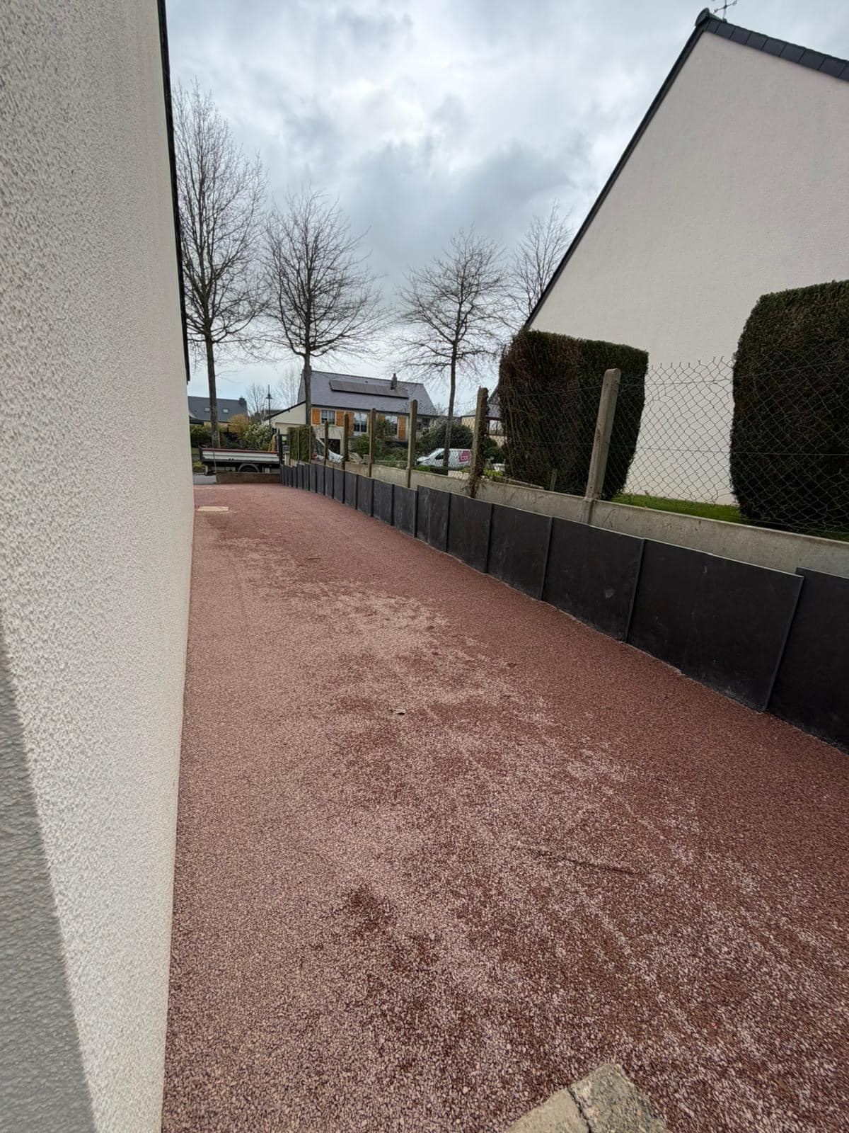 Le gravier stabilisé permet une bonne infiltration de l’eau et limite les flaques. Il offre un rendu naturel et harmonieux autour de la maison.