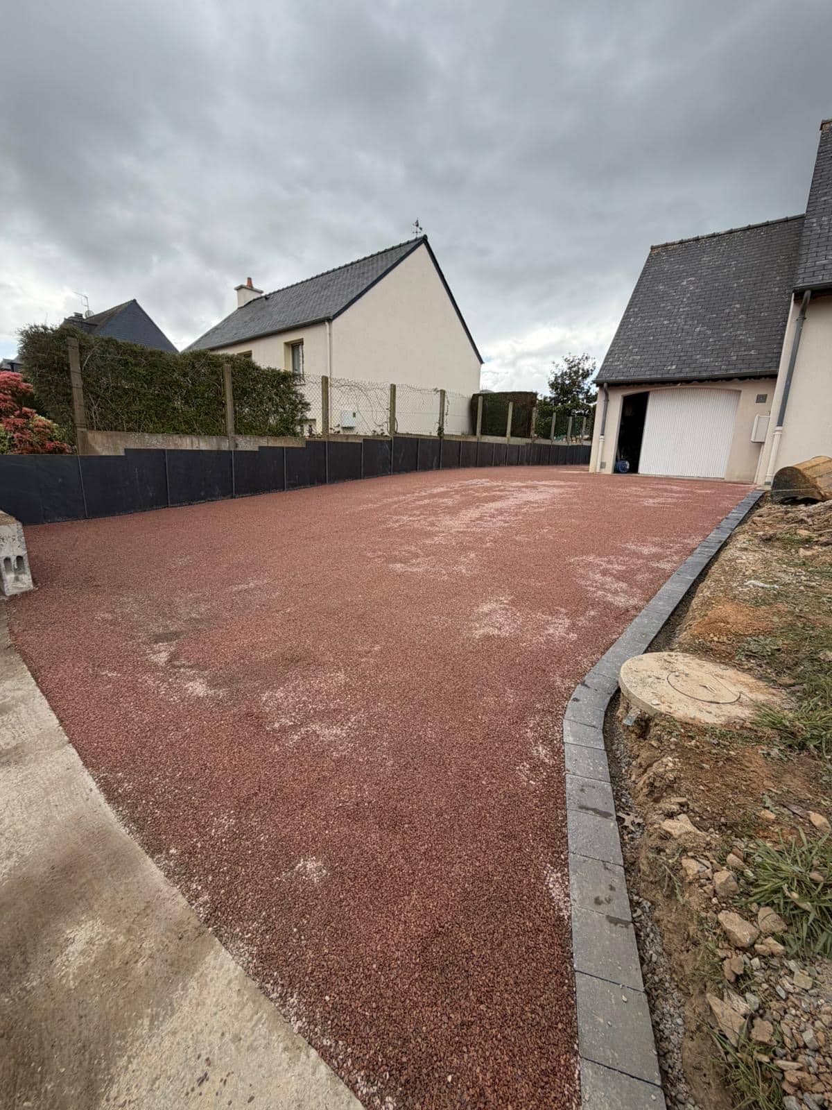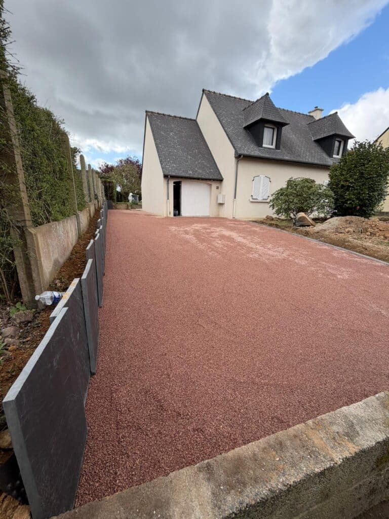 Une entrée de maison en gravier stabilisé à Montfort adaptée aux passages quotidiens