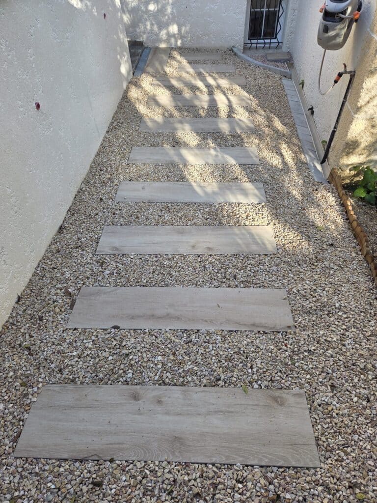 Cet escalier et allée de jardin en gravier et grès cérame à Saint-Aygulf assure stabilité, sécurité et longévité. Le grès cérame résiste aux intempéries, au gel et ne nécessite que très peu d’entretien, tandis que le gravier stabilisé limite la repousse des mauvaises herbes et évite la formation d’ornières. Le résultat est un extérieur propre, durable et agréable à utiliser au quotidien.