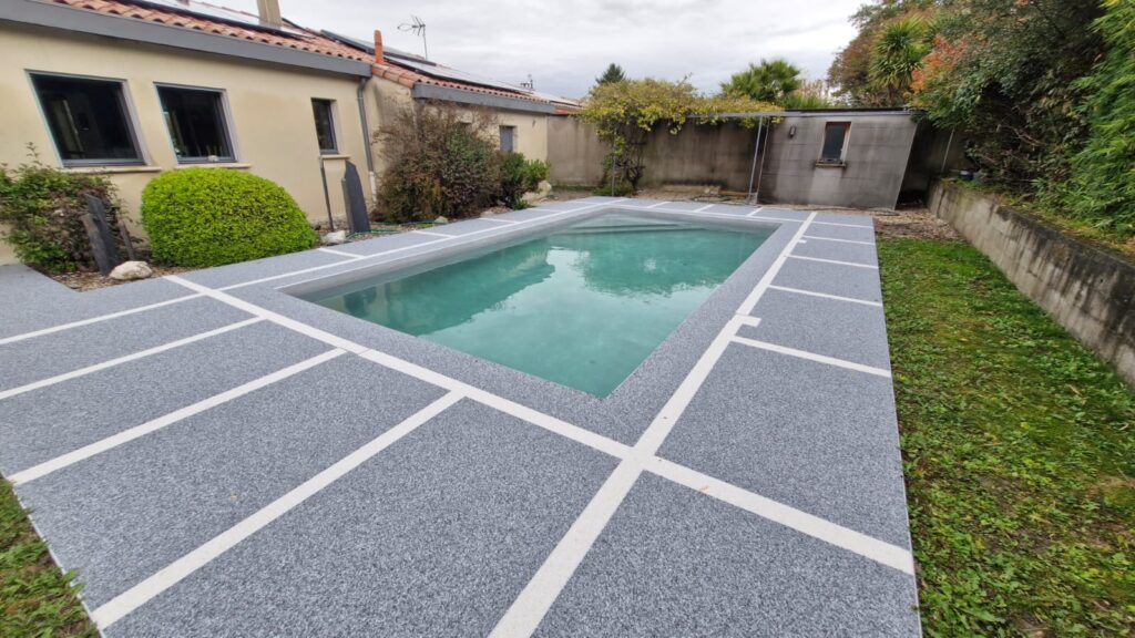 Réalisation d’une plage de piscine en moquette de pierre à Montélimar par l’agence Garden Park Concept, avec notre Gardeneo Drainant®. Ce revêtement apporte un rendu élégant et naturel, idéal pour sublimer l’espace autour de la piscine tout en garantissant confort et durabilité.